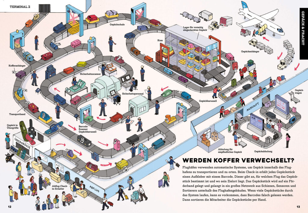 Neben den vielen visuellen Eindrücken vermittelt das Buch auch fundiertes Wissen über die Abläufe am Flughafen. Es zeigt, wie Flugzeuge abgefertigt werden, welche Aufgaben das Personal hat und warum bestimmte Sicherheitsvorkehrungen notwendig sind.