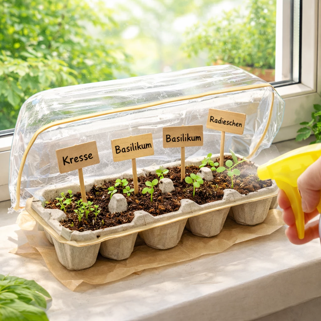 - Mini-Gewächshaus bauen: Den Karton mit Klarsichtfolie locker bedecken, damit es innen warm und feucht bleibt.